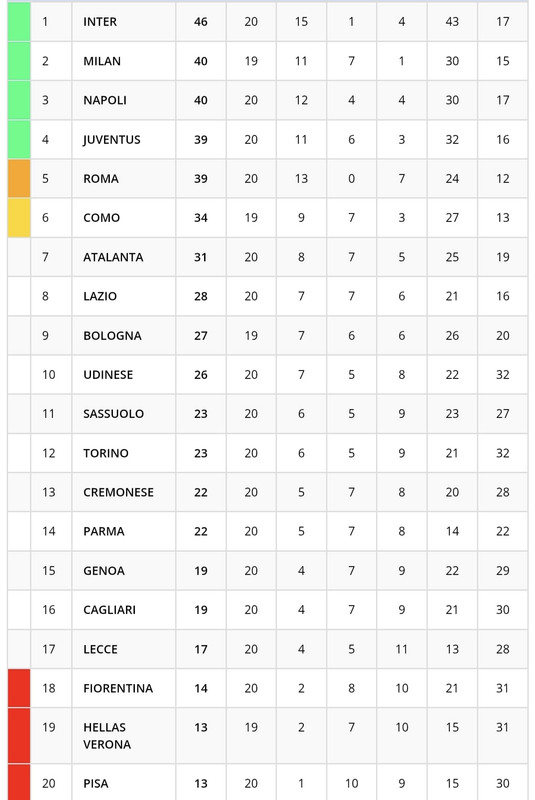L'Inter, grazie al successo contro il Lecce, si porta a quota 46 punti allungando in vetta a +6 su Napoli e Milan. I pugliesi, invece, restano fermi a quot 17 punti al quartultimo posto, a +3 sulla zona retrocessione. Ecco la classifica provvisoria della Serie A: